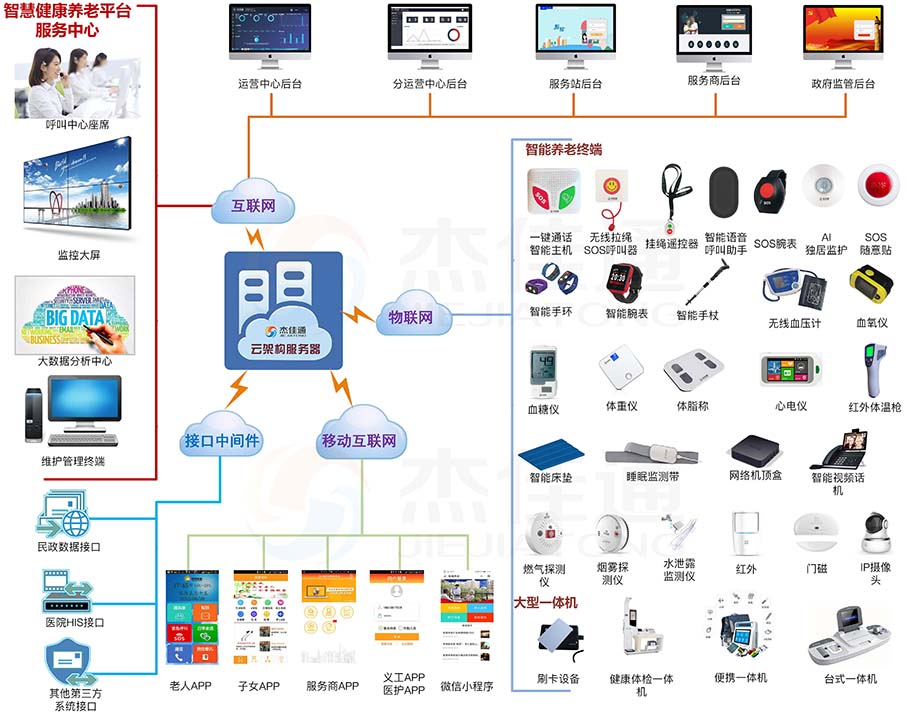杰佳通智慧健康養(yǎng)老平臺(tái)應(yīng)用于居家養(yǎng)老、機(jī)構(gòu)養(yǎng)老、社區(qū)養(yǎng)老、醫(yī)養(yǎng)結(jié)合、地產(chǎn)養(yǎng)老、旅居養(yǎng)老、養(yǎng)老教學(xué)實(shí)訓(xùn)和政府監(jiān)管養(yǎng)老,已有幾千家養(yǎng)老運(yùn)營(yíng)單位在使用。